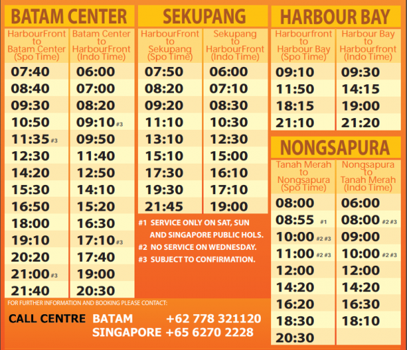 | æ°‘ä¸¹å²›æ—¶é—´æ¯”æ–°åŠ å¡æ—¶é—´æ™š 1 å°æ—¶ – # å¦‚æžœå…¬å…±å‡æ—¥åˆšå¥½æ˜¯å‘¨äº”,则ä¸é€‚用 – * ä»…é™å‘¨å… – 轮渡时间表å¯èƒ½æœ‰å˜åŒ–,æ•䏿å‰é€šçŸ¥ã€‚有关更新时间表,请å‚考 www.brf.com.sg – ç达民丹特拉尼 (BBT) 轮渡ç 头电è¯ï¼š (62) 770 691-935 |