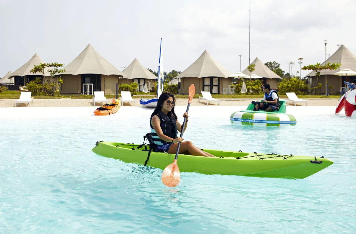 Nestled along the Crystal Lagoon, Natra Bintan offers a family-friendly glamping experience with direct lagoon access and plenty of outdoor fun. Each safari-inspired tent combines comfort and style — complete with plush beds, air-conditioning, semi-outdoor rainforest showers, and private patios.